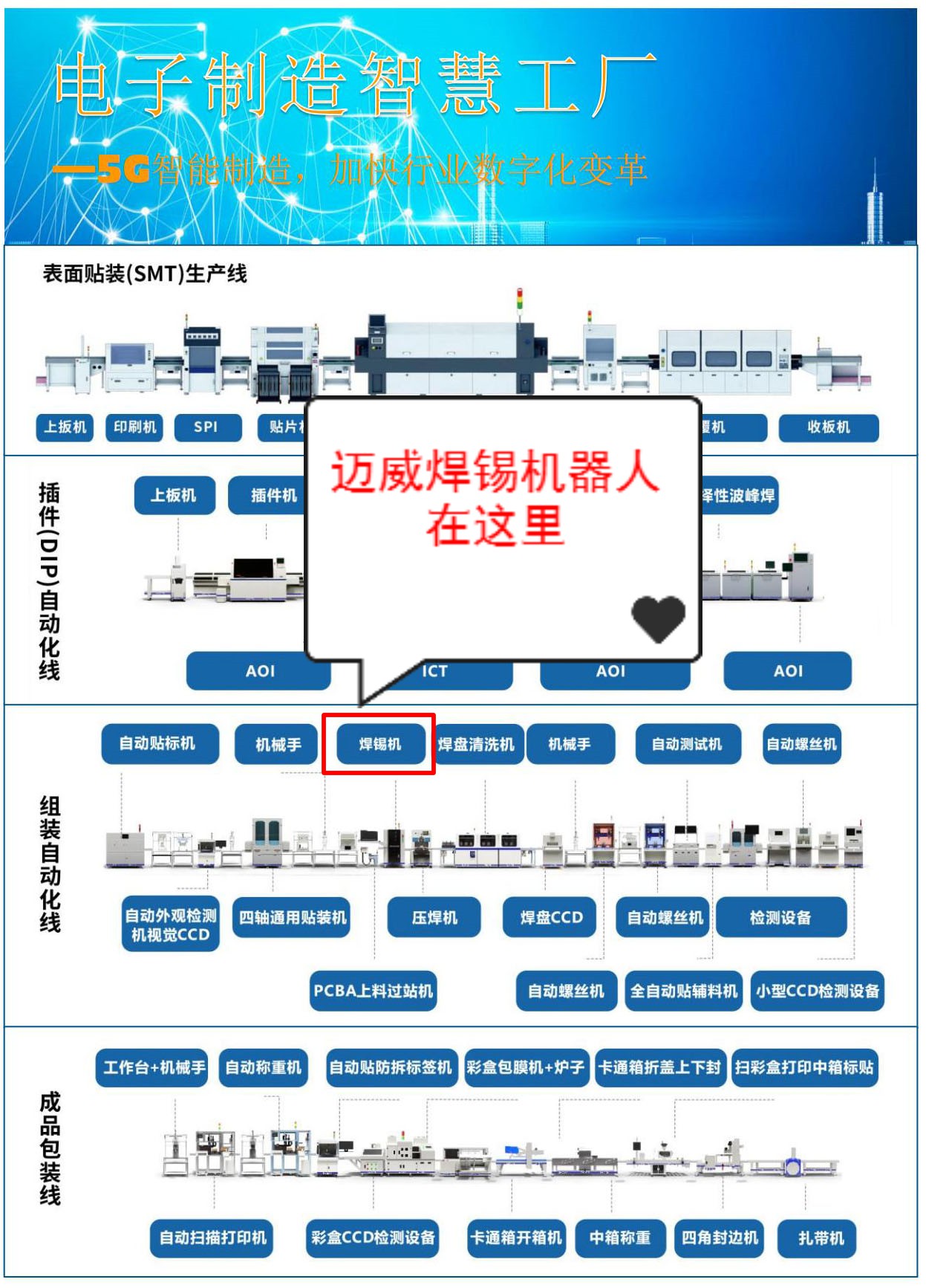 邁威是國內(nèi)領(lǐng)先的焊錫解決方案專業(yè)提供商,專注于焊錫自動化領(lǐng)域,堅持務(wù)實的經(jīng)營理念,持續(xù)創(chuàng)新,為廣大電子產(chǎn)品制造商提供有競爭力的焊錫設(shè)備。并致力于焊錫技術(shù)的研究與推廣,不斷提升客戶產(chǎn)品競爭力。公司自推出首臺電腦版焊錫機以來,不斷加大在焊錫領(lǐng)域的研發(fā)力度,陸續(xù)推出了多軸全自動焊錫機、視覺焊錫機、伺服焊錫機、全自動焊線機、智能激光焊錫機等產(chǎn)品。